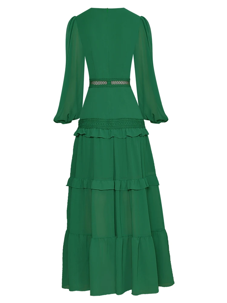 يأتي الفستان بمزيج من اللون الأخضر الجذاب والأحمر الحيوي، ما يضيف لمسة من الأناقة والجاذبية.